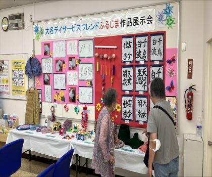 2025年8月1日~8月15日の間、石嶺支店ロビーにて『大名デイサービス「ふるじま」作品展』を開催いたしました。利用者の皆さまが心を込めて制作された書道や編み物などの作品を展示しました。ご家族と一緒にご来店された方も多く、作品を前に笑顔があふれるひとときとなりました。「自分の作品を多くの方に見てもらえてうれしい」「また頑張って作りたい」と、制作活動への意欲が高まったとの声も寄せられています。地域の皆さまとのつながりを感じられる、温かい展示となりました。