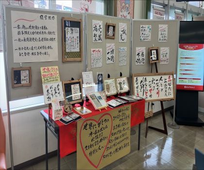 豊見城支店では、2025年8月18日~8月29日の2週間、「野原恵子先生 書道ロビー展」を開催しました。日めくりカレンダーや飾り物で素晴らしい作品が展示され、開催中には野原先生に来店いただき、来店されたお客さまへ好きな言葉や名前を色紙に書いていただきました。色鮮やかな色紙は大変好評でした。また、企業が書いてもらいたい言葉として経営理念を野原先生に書いていただき、企業からも大変喜ばれました。