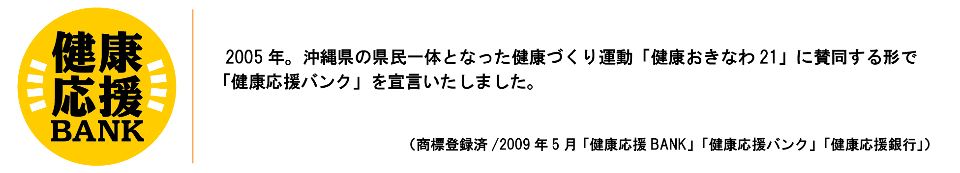 2015年1月に宣言しておりました「ひやみかち健康経営宣言」(沖縄労働局)は「福寿うちな~健康宣言」(協会けんぽ沖縄支部)と統合され、2021年4月より「うちなー健康経営宣言」としてリニューアルしました。当行は、これからも「健康応援BANK」として、健康経営に積極的に取り組み、長寿県沖縄の復活と地域社会の発展に貢献してまいります。